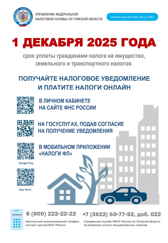 Напоминаем, срок уплаты имущественных налогов с физических лиц за 2024 год не позднее 1 декабря 2025 года.